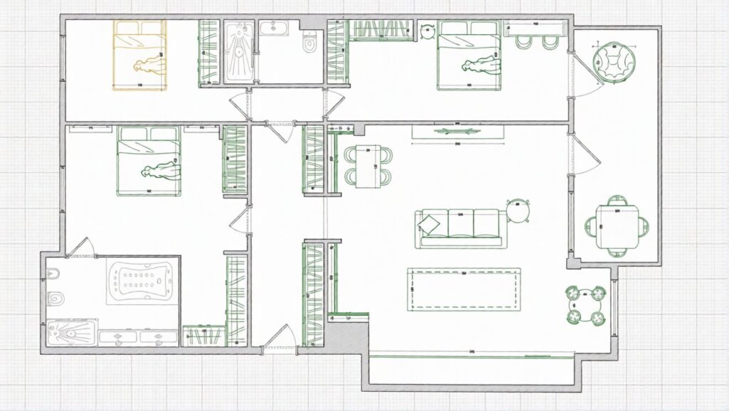 The apartment features 150 m² of living space, including three spacious bedrooms and two bathrooms. The master bedroom includes an en-suite bathroom with jacuzzi, creating a private and relaxing environment. The open-plan kitchen connects seamlessly with the bright living room, leading directly to a large terrace with panoramic sea views.